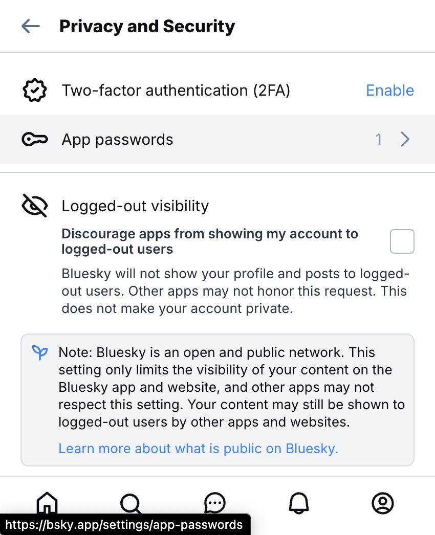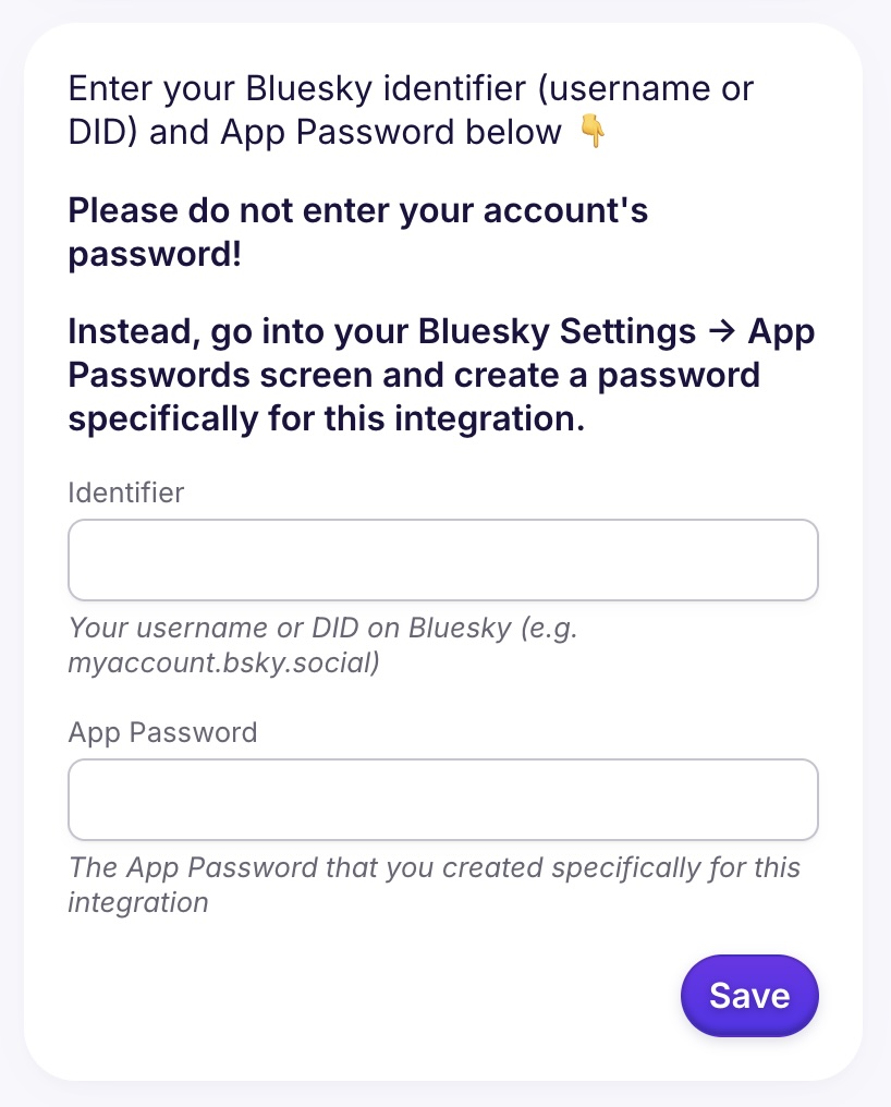 An App Password is a feature from Bluesky that allows you to create a password specifically for this integration.